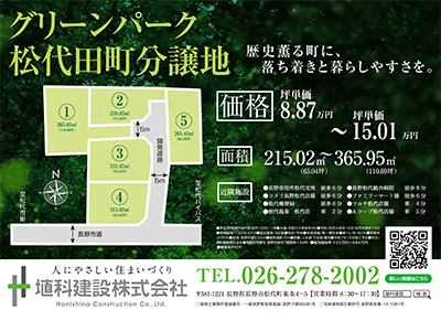 | 物件所在地 | '家庭菜園が楽しめる。ゆとりある敷地' グリーンパーク松代田町分譲地 |