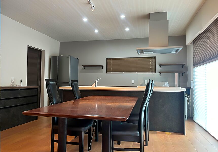 LDK空間の間取りを変更。アイランドキッチンに変えたことで、お料理をしながら今までよりも家族との団欒を愉しめるように変身。内装材や照明も変えることで新築のように生まれ変わり、スタイリッシュな装いへ。サッシ交換もしているので断熱性能も格段にUP。1F既存和室は間取りはそのままで、仕上げをきれいに。2F洋室→和室に変身したことで、どこか旅館の客室を感じさせるような一室へと変身。外装は以前は白を基調としていたが、外壁上貼りとし温かみがあるものに。